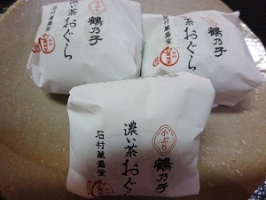 鶴乃子はマシュマロ生地の中に黄味あんが入っていますが、濃い茶おぐらは抹茶を使ったマシュマロ生地に小倉あんが入っています。